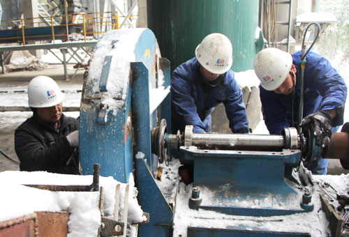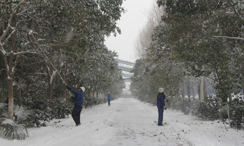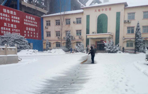 纷纷扬扬的雪花,把整个大地裹得严严实实,室外温度降到零下10度左右,虽然天气非常寒冷,但丝毫阻挡不住大地员工工作的热情。为了大家出行方便,为了保护树木不受伤害,各部门自发组织清扫积雪,特别是生产一线员工,在搞好检修工作的同时,积极组织清理积雪,做到检修清雪两不误。在冰冷的美景之下,一个个热火朝天的场面、一个个忙忙碌碌的身影、一张张朴实灿烂的笑脸,成为这雪天里最美的风景线。