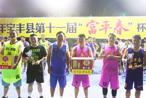 8月14日晚,2016年宝丰县“富平春”杯第十一届篮球夜市闭幕。 本次活动由河南省富平春酒业有限公司赞助,比赛历时26天51场比赛,共吸引了来自社会各界的21支代表队300多名篮球爱好者参加,分为少年、成年、老年三个组别,是历届比赛中参与队数最多,历时最长、影响最大的一届。 经过激烈角逐,汇众篮球代表队获少年组冠军;盈瑞国际大酒店代表队、富平春酒业代表队分别获成年组冠军、亚军。县人大常委会副主任崔建利出席闭幕式,并为获得成年组前三名的代表队颁奖。 ![]() 获奖代表队 ![]() 获得成年组亚军的富平春酒业代表队  |