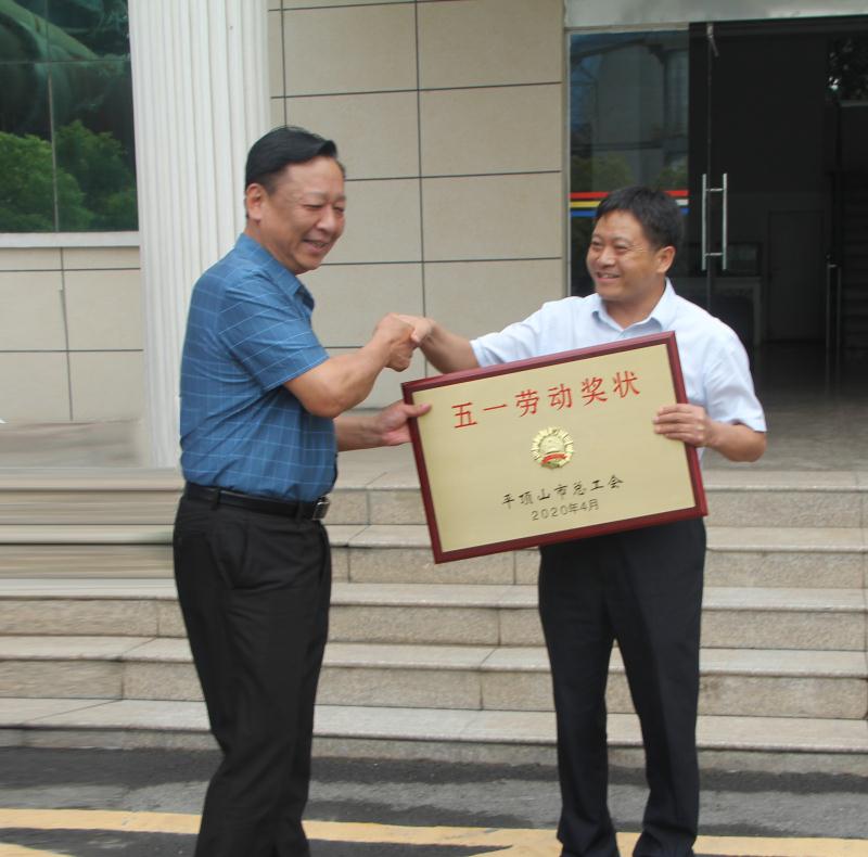 6月19日下午,宝丰县人大常委会副主任、总工会主席崔建利,县总工会党组书记、常务副主席张艳峰等一行,受平顶山市总工会委托来到大地公司,为荣获“平顶山市五一劳动奖状”的大地公司授牌。集团总裁王国杰代表公司接受荣誉奖牌。
