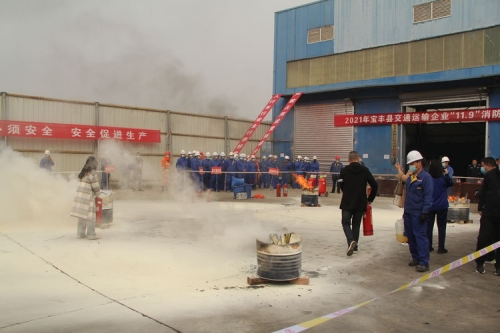 为贯彻落实“11.9”消防宣传月活动,11月4日上午,宝丰通达公司紧紧围绕“落实消防责任、防范安全风险”主题组织开展冬季消防应急演练,县交通运输局党组成员、副局长刘亚伟、县“三网"办消防大队副主任王拥超等领导到会指导,集团副总裁兼大地公司总经理赵中要、宝丰县通达运输公司总经理魏建敏等领导及县交警大队、交通运输局、全县道路运输企业代表现场观摩。