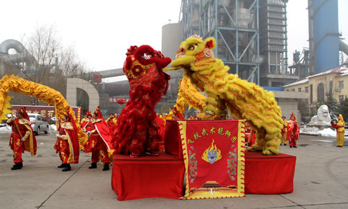 龙腾狮跃闹新春,中原大地喜事多。2月8日(农历正月初九)上午,大地集团邀请许昌盘鼓队,武术龙狮团70多人参加宝丰县第二十届民间艺术大赛。通过精彩的文艺表演向全县人民问好,为广大群众奉上一场活色生香的文艺盛宴。 喧天的锣鼓敲起来,威武的巨龙舞起来,凶猛的狮子跃起来。大地集团表演的龙狮舞活灵活现,形威神俏。一条蛟龙时而上下翻腾,时而左右滚动。两个衣着不同服饰的狮子刚强勇猛,竞相争霸。时而龙狮腾跃,时而蛟龙出海,时而双狮争斗……。惟妙惟肖、滑稽幽默的表演赢得了在场观众的阵阵掌声和好评。大家纷纷拿起摄像机、照相机或手机,记录下这精彩美好的瞬间。 金狮舞出了大地人意气风发、坚忍不拔的干事精神。蛟龙跃出了大地人披荆斩刺、战天斗地的决心和信心。迎着改革开放的春风,大地集团将继续乘风破浪,扬帆远航,驶向更加灿烂辉煌的明天!