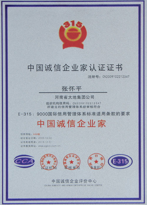 18新利(中国) >> 走进大地 >>资质荣誉 >> 中国诚信企业家